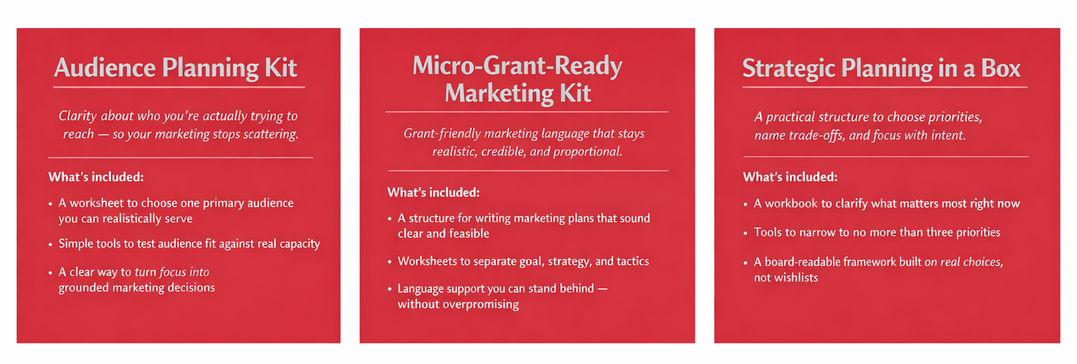 Marketing Made Practical offers downloadable planning and marketing tools for artists, makers, and creative organizations working with real constraints: